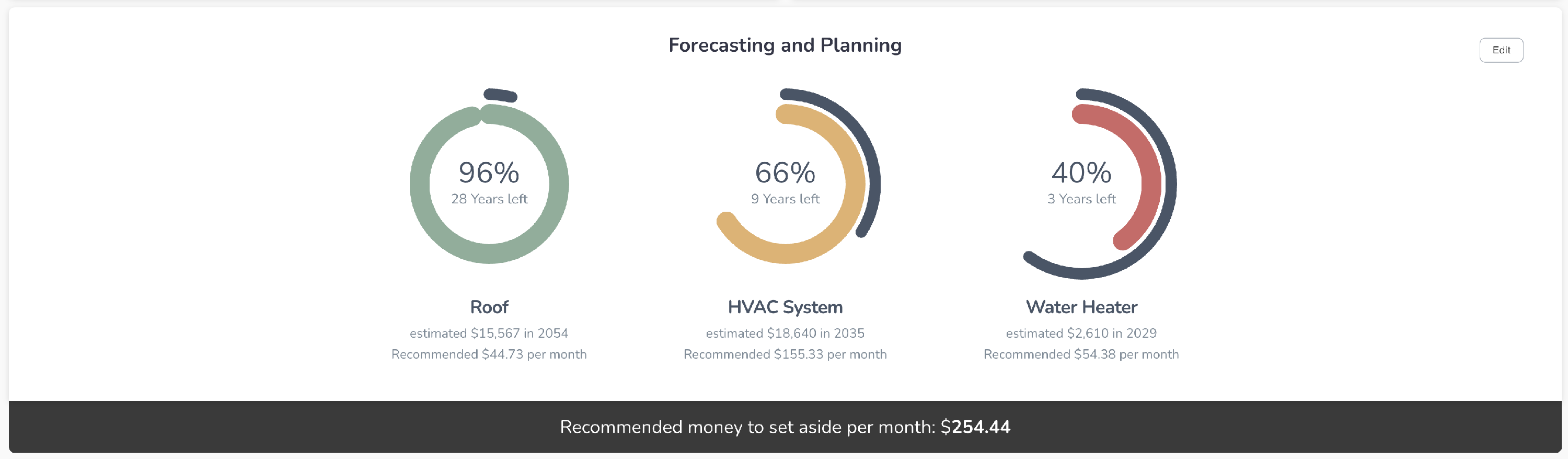 With Forecasting and Planning, you can easily track the life of your roof, HVAC system, and water heater. You'll see how much these expenses are estimated to cost as well as how much to set aside monthly to pay for these expenses. In order to track this info, you will need to click on the edit button in the upper right of this section.