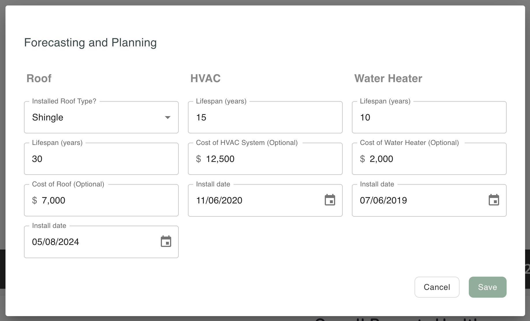 Upon clicking the edit button, you will be taken to a pop-up where you can put in all your info for your roof, HVAC system, and water heater. All of these areas will ask for you for the lifespan, cost, and installation date of these expenses. For your roof, it will also ask for your roof type.